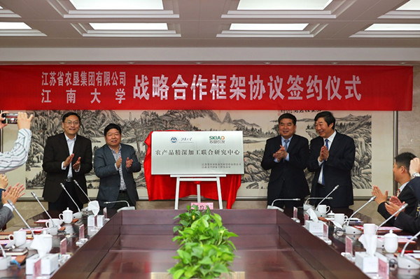 魏紅軍對雙方全面戰(zhàn)略合作框架協(xié)議的簽署及農產品精深加工聯(lián)合研究中心的掛牌表示祝賀,對蘇墾農發(fā)股份公司與江南大學國家工程實驗室聚焦國際“大健康、大食品、大產業(yè)”前沿技術,合作共建農產品精深加工聯(lián)合研究中心給予充分肯定。他指出,江蘇農墾與江南大學有著長期而深厚的合作基礎,此次建立全面戰(zhàn)略合作關系、共建農產品精深加工聯(lián)合研究中心,是雙方發(fā)揮各自優(yōu)勢、推進“產學研用”深度合作的重要舉措。期待雙方在合作中,圍繞優(yōu)勢互補、強強聯(lián)合,深入開展協(xié)同創(chuàng)新,共同打造全省農產品精深加工、農產品質量安全、農業(yè)物聯(lián)網應用的示范基地和校企緊密合作的新典范。希望雙方以此為起點,將戰(zhàn)略合作向更深領域、更高層次推進,深度整合、共享科技資源和產業(yè)資源,共同為全省乃至全國農業(yè)現代化建設作出更大貢獻。