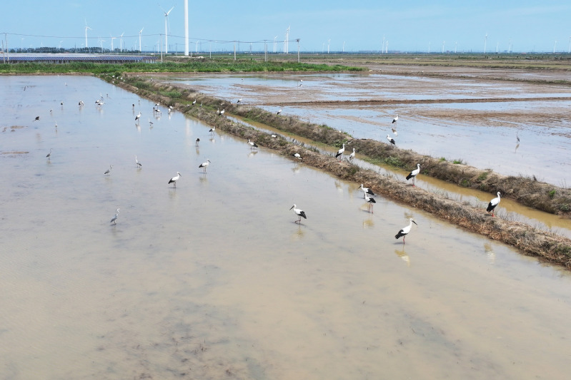 6月23日,江蘇省鹽城市射陽縣臨海農場順泰生產區的水田里,50余只國家一級保護動物東方白鸛姿態優雅,正悠然漫步、覓食,與水田的碧波相互映襯,構成一幅靈動的生態畫卷。