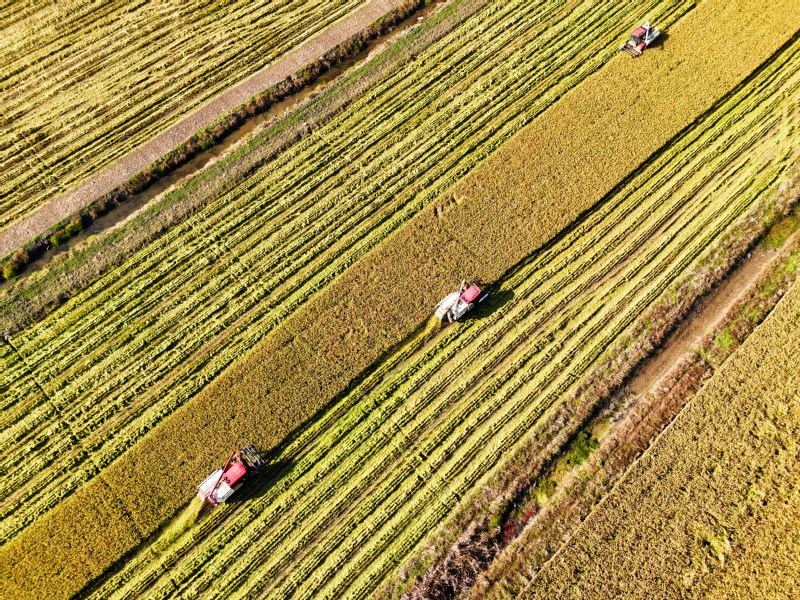 11月2日,在江蘇省連云港市海州區江蘇農墾崗埠農場的高標準農田里,職工們利用晴好天氣,積極開展水稻搶收工作,確保不誤農時、顆粒歸倉。