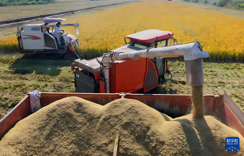 11月5日,江蘇省農(nóng)墾農(nóng)業(yè)發(fā)展股份有限公司南通分公司收割機(jī)卸運(yùn)剛剛收割的水稻(無人機(jī)照片)。